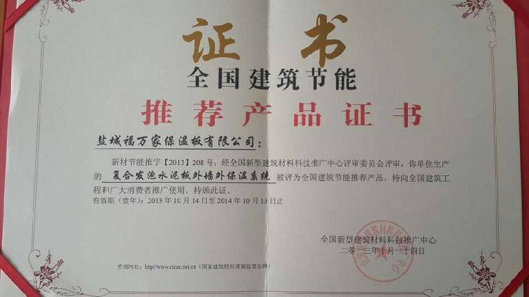 [2013年10月14日,我司研发的复合发泡水泥板外墙外保温系统,喜获全国新型建筑材料科技推广中心颁发的“全国建筑节能推荐产品证书”。(附图)]
