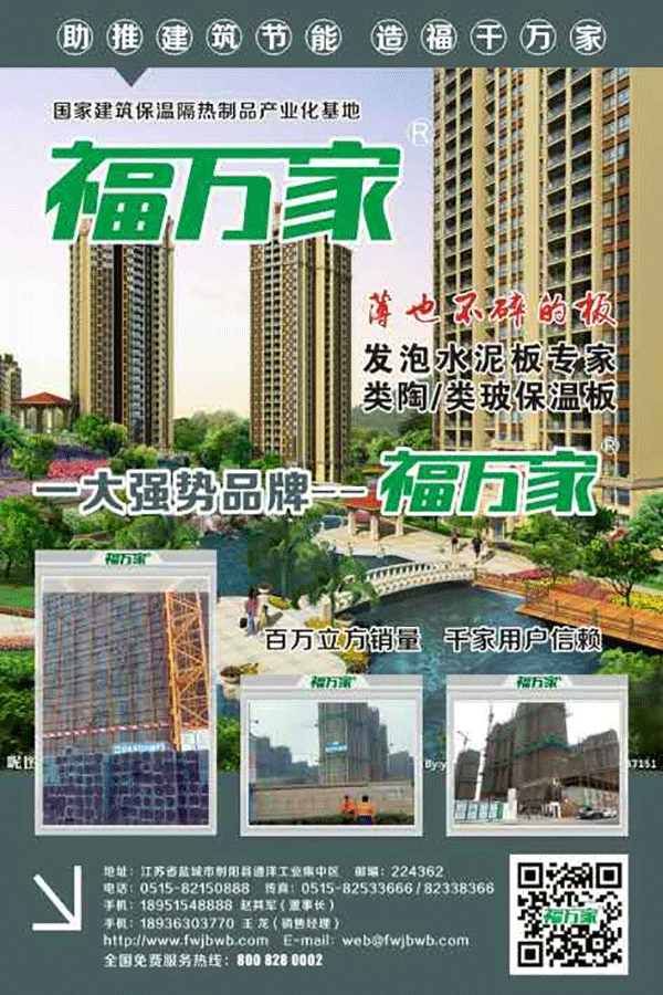 盐城福万家保温板有限公司,是江苏省建筑节能协会常务理事单位、全国建筑保温隔热专委会常务委员单位,上海市建筑材料行业协会会员,专业从事建筑物新型外墙防火保温板材的研发制造及应用推广,座落在“后羿嫦娥故里,东方湿地鹤乡”--江苏沿海射阳县境内。公司总投资 3800 余万元,厂区总占地 100 多亩,建筑面积 30000 多平方米,现有员工 200 多人,拥有自主研发的目前国内先进的--高模轨道运送、高温养护循环生产线八条。公司还成功地研制出类陶TM、类玻TM系列产品,深受客户青睐。公司具有年 30 万立方米的生产能力,并已形成科研开发、规模化生产和专业化技术服务的完整体系,成为华东地区乃至全国规模较大的水泥发泡板生产基地。
